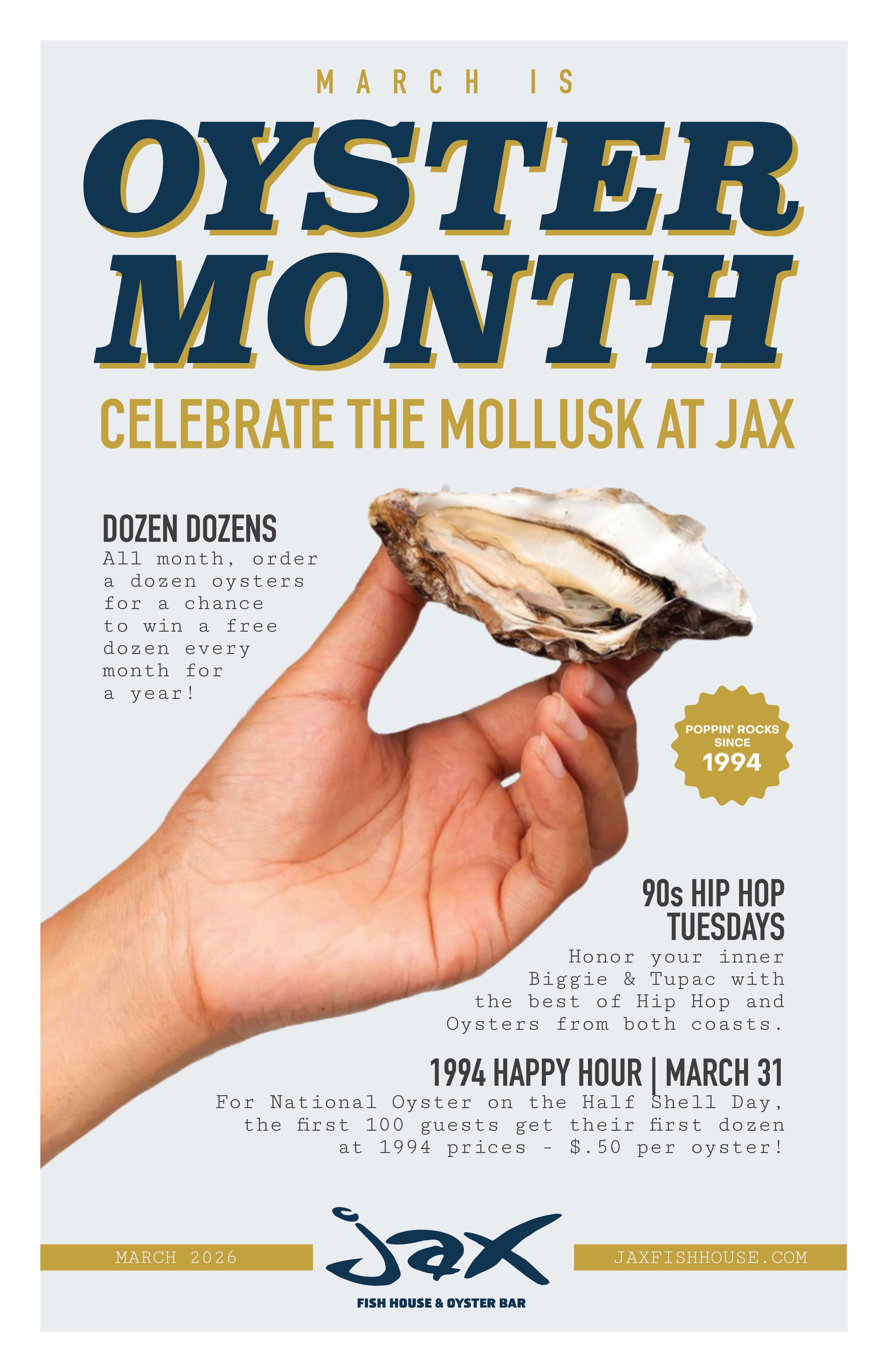 Celebrate the mollusk all March long! We've been poppin' rocks since 1994, so it's only right to do it up with specials and giveaways like: